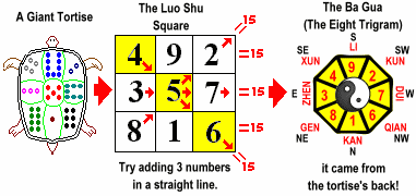 According to ancient Chinese legends, a giant tortoise surfaced from the River Lo in central China around 4,000 years ago. The ancient Chinese found a pattern on a tortoise shell (refer to the extreme left picture above). There were circular dots of numbers on the giant tortoise that were arranged in a three-by-three nine grid pattern on it's shell.